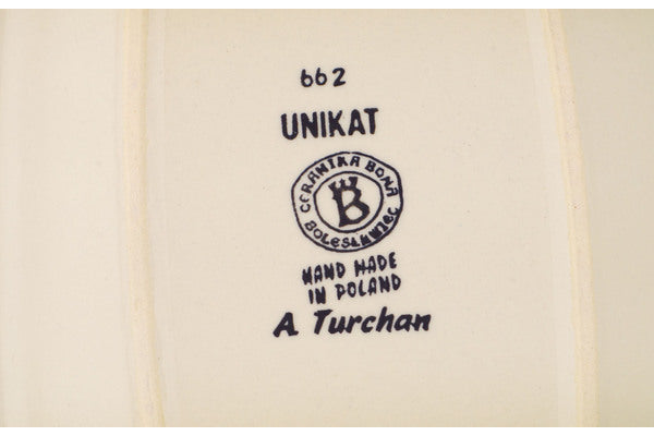 This is a Polish pottery Unikat (Signature) Platter, which means that it has been hand painted with both sponges and brushes and it is signed by the artist who painted it. Unikat pieces are the most intricate works of art. Larger Unikat items take hours of very careful work to finish.