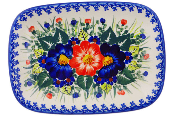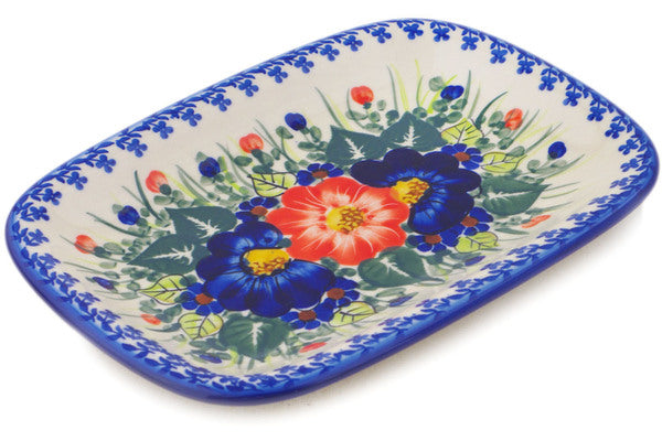 This Polish Pottery Platter is handmade and handpainted by the Ceramika Bona factory in Boleslawiec, Poland. Manufacturer item number H7143Q. It is 1" high and measures 9¾" by 7". The weight of this Platter is 1.5 lbs. It is part of the Poppy Trio Collection.