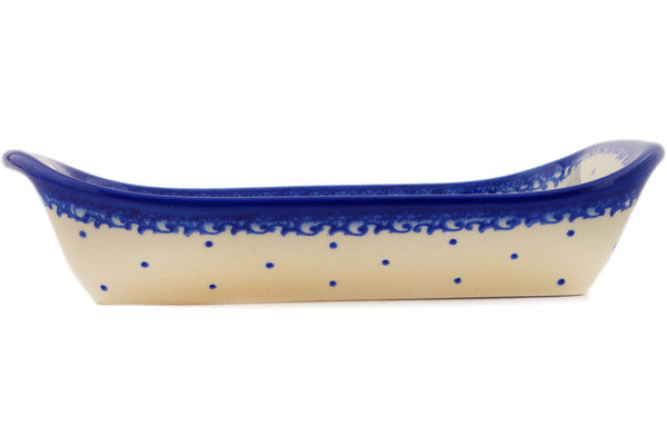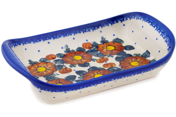 This Polish Pottery Platter with Handles is handmade and handpainted by the Ceramika Bona factory in Boleslawiec, Poland. Manufacturer item number H4062Q. It is 2¼" high and measures 9¾" by 6¼". The weight of this Platter with Handles is 1.7 lbs. It is part of the Autumn Pansies Collection.