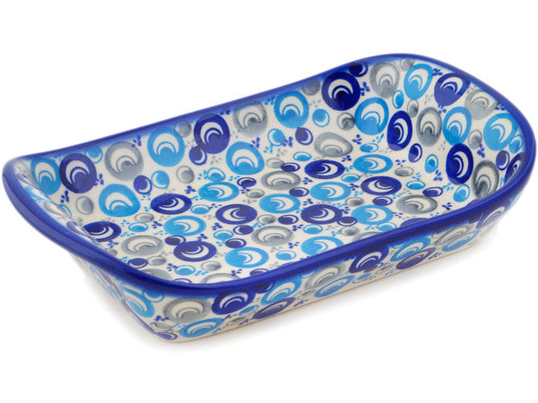 This Polish Pottery Platter with Handles is handmade and handpainted by the Ceramika Bona factory in Boleslawiec, Poland. Manufacturer item number H3141Q. It is 2¼" high and measures 9¾" by 6¼". The weight of this Platter with Handles is 1.7 lbs. It is part of the Blue Peacock Eye Collection.
