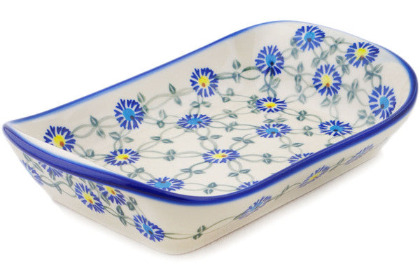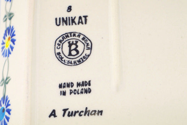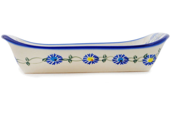 This Polish Pottery Platter with Handles is handmade and handpainted by the Ceramika Bona factory in Boleslawiec, Poland. Manufacturer item number H1878R. It is 2¼" high and measures 9¾" by 6¼". The weight of this Platter with Handles is 1.7 lbs. It is part of the Blue Thistle Beauty Collection.