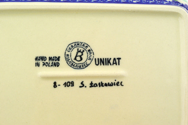 This is a Polish pottery Unikat (Signature) Platter with Handles, which means that it has been hand painted with both sponges and brushes and it is signed by the artist who painted it. Unikat pieces are the most intricate works of art. Larger Unikat items take hours of very careful work to finish.