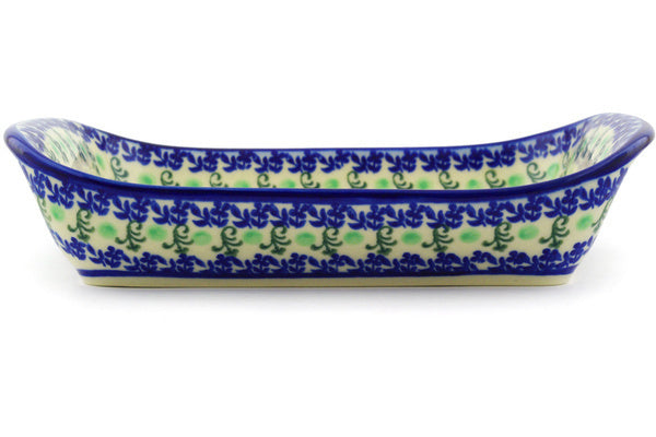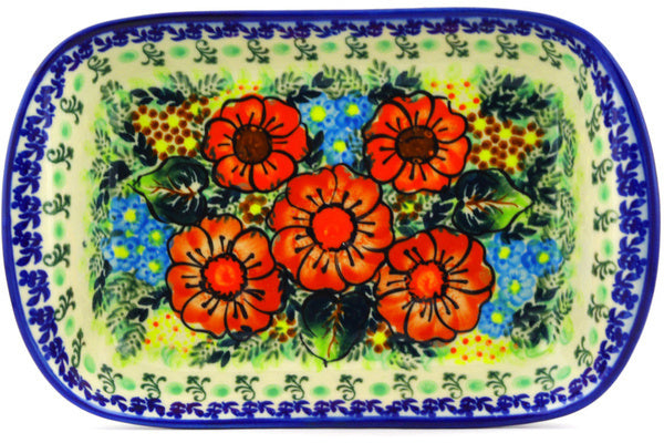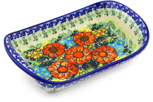 This Polish Pottery Platter with Handles is handmade and handpainted by the Ceramika Bona factory in Boleslawiec, Poland. Manufacturer item number H2018G. It is 2¼" high and measures 9¾" by 6¼". The weight of this Platter with Handles is 1.7 lbs. It is part of the Bold Red Poppies Collection.