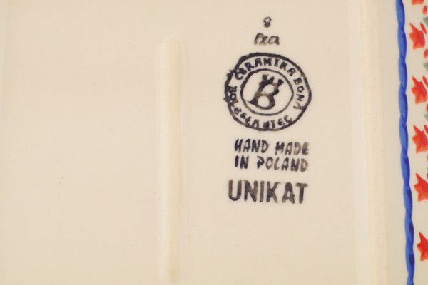 This is a Polish pottery Unikat (Signature) Platter with Handles, which means that it has been hand painted with both sponges and brushes and it is signed by the artist who painted it. Unikat pieces are the most intricate works of art. Larger Unikat items take hours of very careful work to finish.