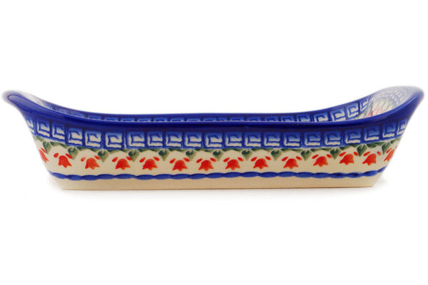 This Polish Pottery Platter with Handles is handmade and handpainted by the Ceramika Bona factory in Boleslawiec, Poland. Manufacturer item number H4033Q. It is 2¼" high and measures 9¾" by 6¼". The weight of this Platter with Handles is 1.7 lbs. It is part of the Brilliant Butterfly Popp Collection.