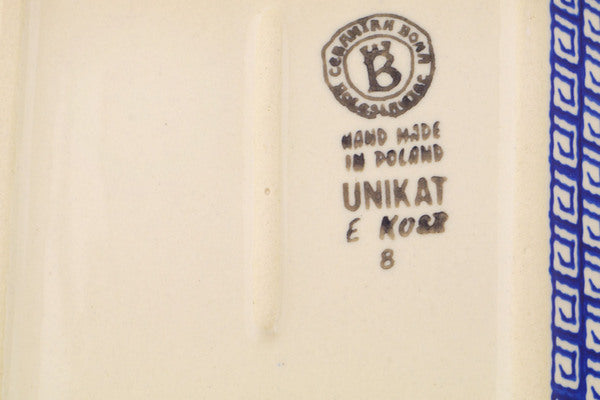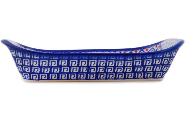 This Polish Pottery Platter with Handles is handmade and handpainted by the Ceramika Bona factory in Boleslawiec, Poland. Manufacturer item number H9715Q. It is 2¼" high and measures 9¾" by 6¼". The weight of this Platter with Handles is 1.7 lbs. It is part of the Grecian Fire Tulips Collection.