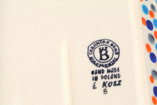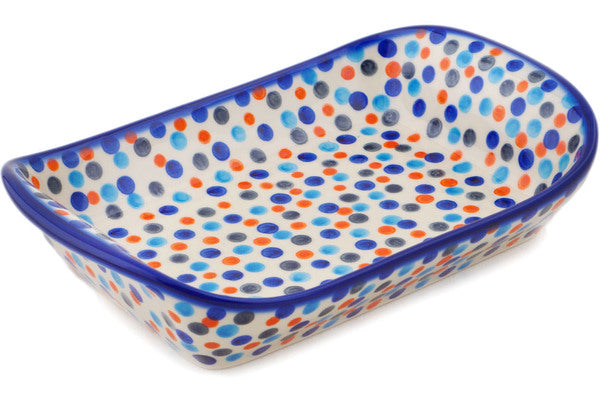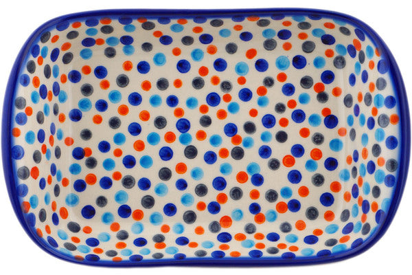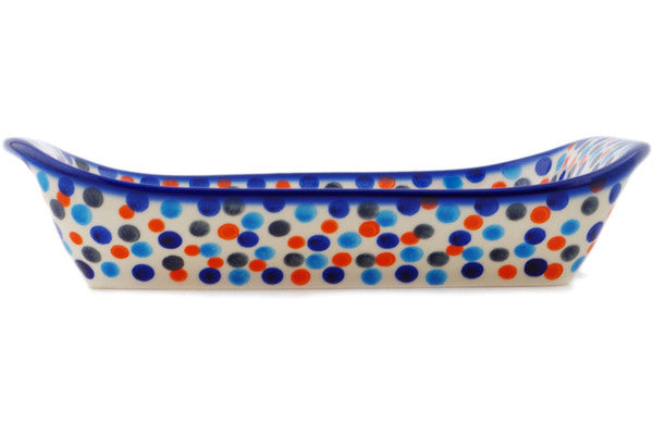 This Polish Pottery Platter with Handles is handmade and handpainted by the Ceramika Bona factory in Boleslawiec, Poland. Manufacturer item number H2051R. It is 2¼" high and measures 9¾" by 6¼". The weight of this Platter with Handles is 1.7 lbs. It is part of the Polka Dot Frenzy Collection.