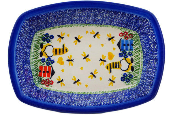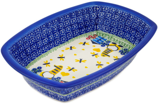 This Polish Pottery Rectangular Baker is handmade and handpainted by the Ceramika Nina factory in Boleslawiec, Poland. Manufacturer item number H2573P. It is 2¼" high and measures 9¾" by 7". The capacity of this Rectangular Baker is 51.40 oz (brimful) and it weighs 1.7 lbs. It is part of the Beekeeper Gnome Collection.