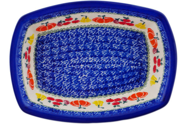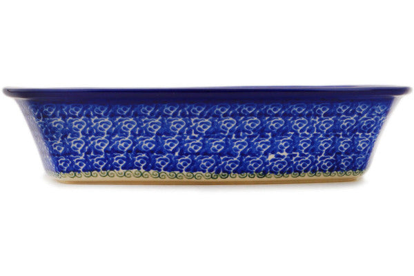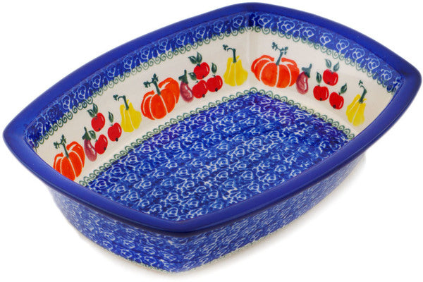This Polish Pottery Rectangular Baker is handmade and handpainted by the Ceramika Bona factory in Boleslawiec, Poland. Manufacturer item number H1745P. It is 2¼" high and measures 9¾" by 7". The capacity of this Rectangular Baker is 51.40 oz (brimful) and it weighs 1.7 lbs. It is part of the Fresh Vegetable Garden Collection.