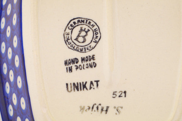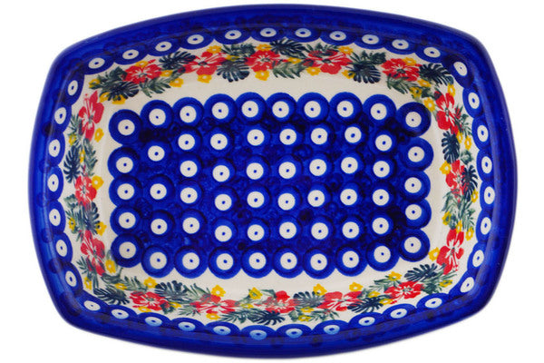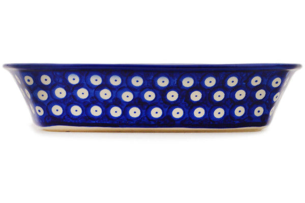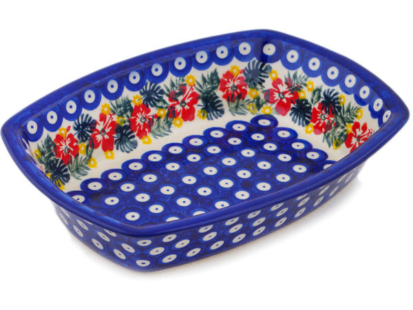 This Polish Pottery Rectangular Baker is handmade and handpainted by the Ceramika Bona factory in Boleslawiec, Poland. Manufacturer item number H1789P. It is 2¼" high and measures 9¾" by 7". The capacity of this Rectangular Baker is 51.40 oz (brimful) and it weighs 1.7 lbs. It is part of the Tropical Peacock Collection.