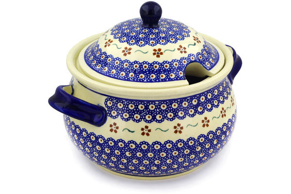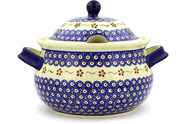 This Polish Pottery Tureen is handmade and handpainted by the Zaklady Ceramiczne factory in Boleslawiec, Poland. Manufacturer item number H7144D. It is 8¼" high and measures 11¼" by 8¾". The capacity of this Tureen is 101.44 oz (brimful) and it weighs 5.3 lbs. It is part of the Sweet Red Flower Collection.