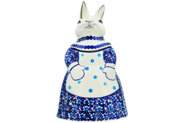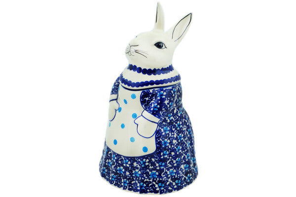 This Polish Pottery Bunny Shaped Jar is handmade and handpainted by the Manufaktura factory in Boleslawiec, Poland. Manufacturer item number H2521M. It is 11½" high and measures 7" by 6¼". The capacity of this Bunny Shaped Jar is 57.48 oz (brimful) and it weighs 3.5 lbs. It is part of the Flowers On The Lake Collection.