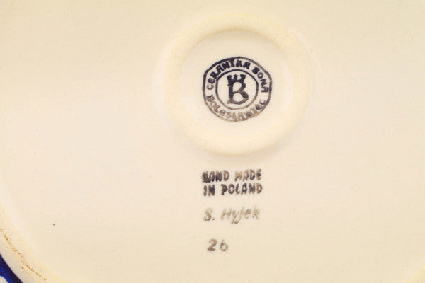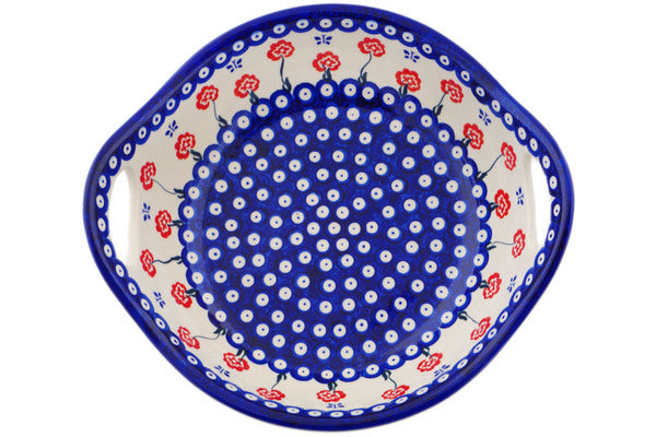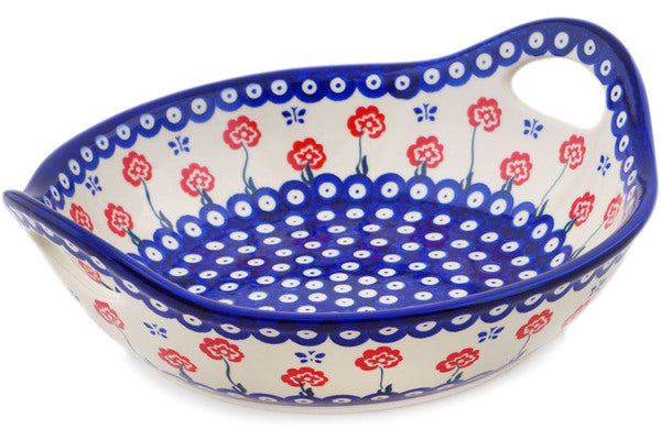 This Polish Pottery Bowl with Handles is handmade and handpainted by the Ceramika Bona factory in Boleslawiec, Poland. Manufacturer item number H7855O. It is 4" high and measures 12½" by 11¾". The capacity of this Bowl with Handles is 42.27 oz (brimful) and it weighs 3.6 lbs. It is part of the Blue Eye Spring Collection.