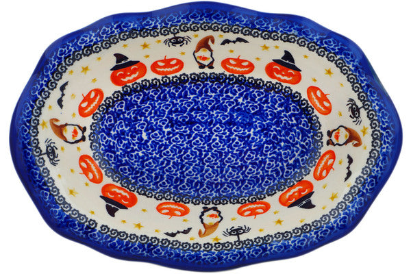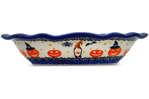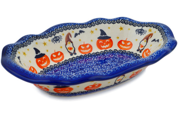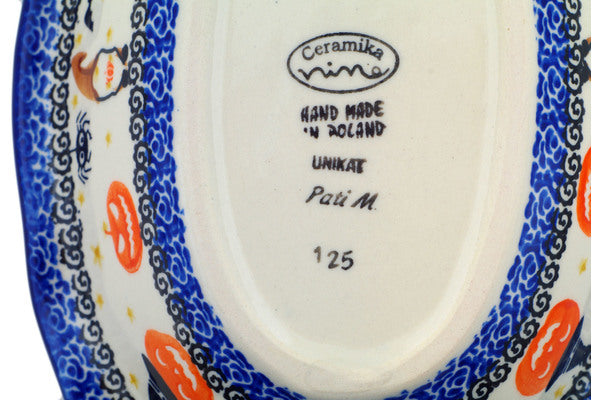This Polish Pottery Oval Bowl is handmade and handpainted by the Ceramika Nina factory in Boleslawiec, Poland. Manufacturer item number H1517P. It is 2¼" high and measures 11½" by 7¾". The capacity of this Oval Bowl is 27.05 oz (brimful) and it weighs 1.9 lbs. It is part of the Harvest Haunt Collection.