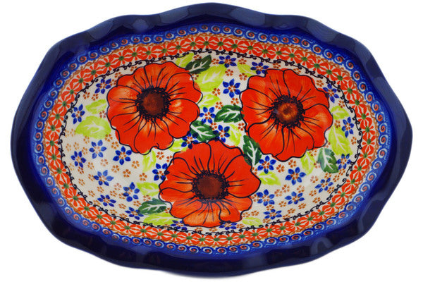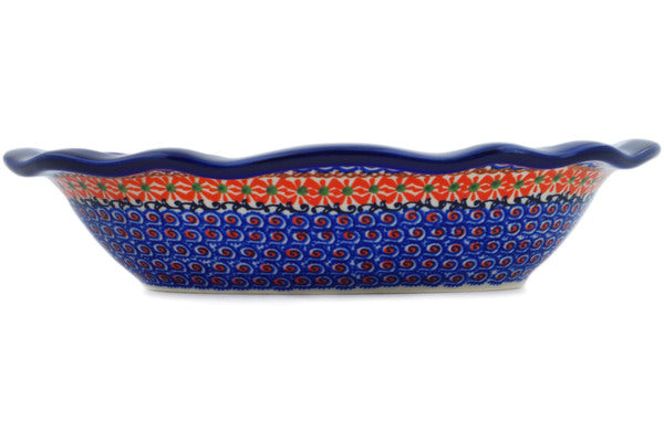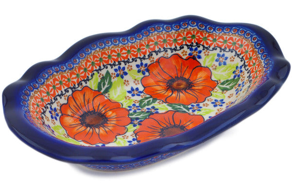This Polish Pottery Oval Bowl is handmade and handpainted by the Ceramika Nina factory in Boleslawiec, Poland. Manufacturer item number H3272P. It is 2¼" high and measures 11½" by 7¾". The capacity of this Oval Bowl is 27.05 oz (brimful) and it weighs 1.9 lbs. It is part of the Orange Zinnia Collection.