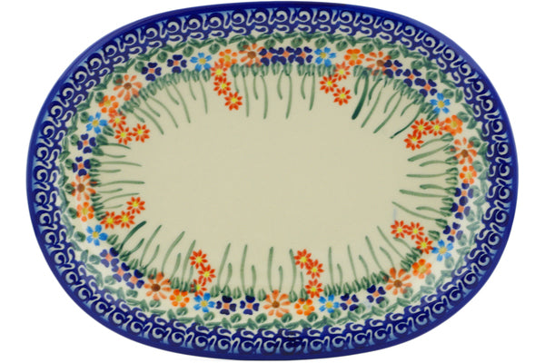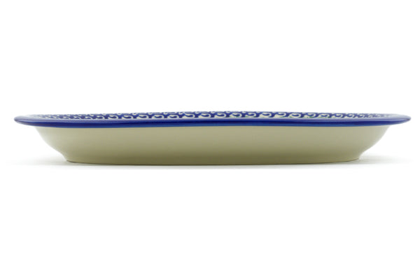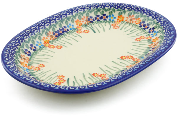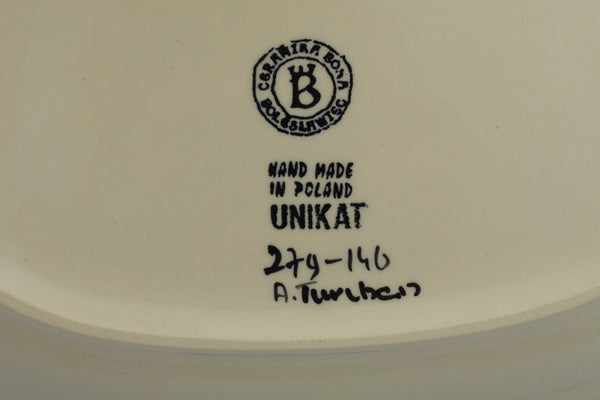 This Polish Pottery Oval Platter is handmade and handpainted by the Ceramika Bona factory in Boleslawiec, Poland. Manufacturer item number H3205J. It is 1¼" high and measures 11½" by 8½". The capacity of this Oval Platter is 18.60 oz (brimful) and it weighs 2.3 lbs. It is part of the Blissful Daisy Collection.