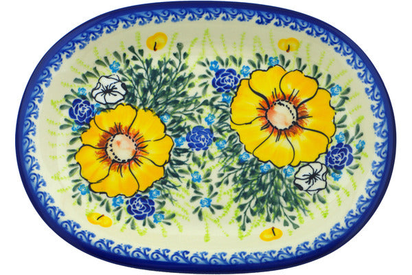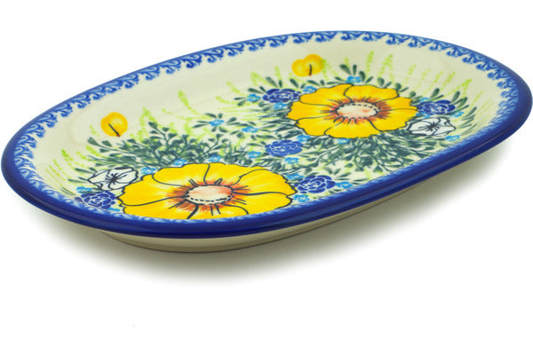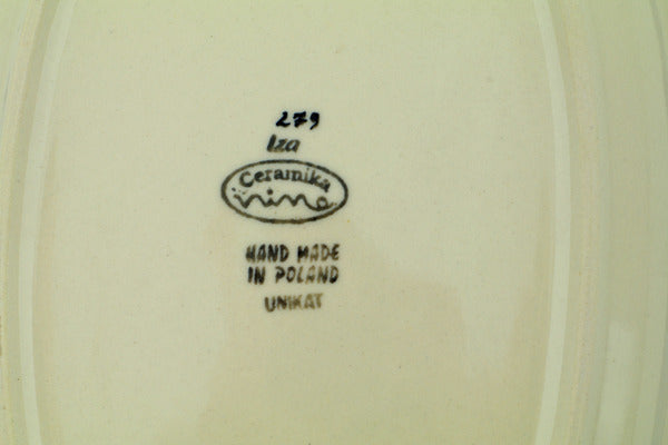 This Polish Pottery Oval Platter is handmade and handpainted by the Ceramika Nina factory in Boleslawiec, Poland. Manufacturer item number H0311P. It is 1¼" high and measures 11½" by 8½". The capacity of this Oval Platter is 18.60 oz (brimful) and it weighs 2.3 lbs. It is part of the Bright Blooms Collection.
