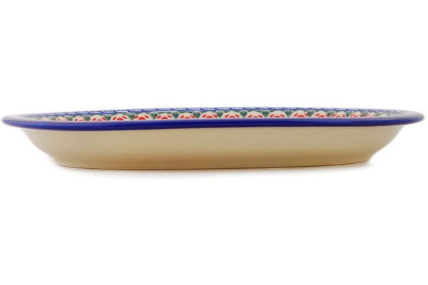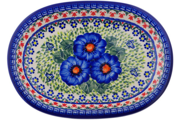 This Polish Pottery Oval Platter is handmade and handpainted by the Ceramika Bona factory in Boleslawiec, Poland. Manufacturer item number H3172Q. It is 1¼" high and measures 11½" by 8½". The capacity of this Oval Platter is 18.60 oz (brimful) and it weighs 2.3 lbs. It is part of the Brilliant Butterfly Popp Collection.
