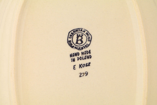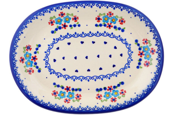 This Polish Pottery Oval Platter is handmade and handpainted by the Ceramika Bona factory in Boleslawiec, Poland. Manufacturer item number H1707Q. It is 1¼" high and measures 11½" by 8½". The capacity of this Oval Platter is 18.60 oz (brimful) and it weighs 2.3 lbs. It is part of the Hearts And Flowers Collection.