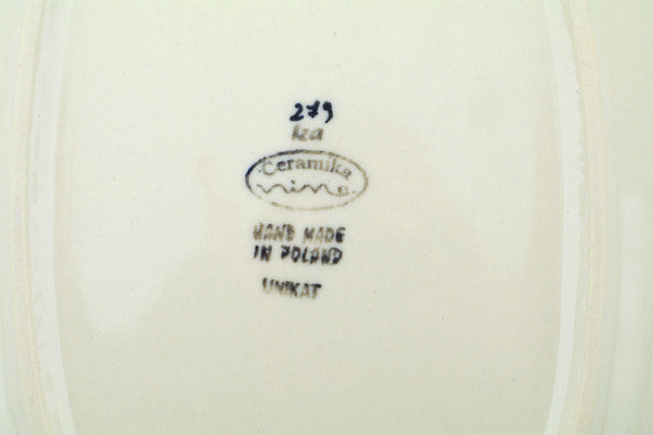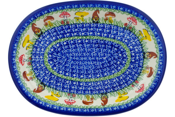 This Polish Pottery Oval Platter is handmade and handpainted by the Ceramika Nina factory in Boleslawiec, Poland. Manufacturer item number H1360P. It is 1¼" high and measures 11½" by 8½". The capacity of this Oval Platter is 18.60 oz (brimful) and it weighs 2.3 lbs. It is part of the Mushroom Garden Collection.