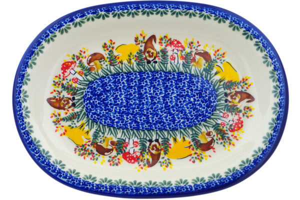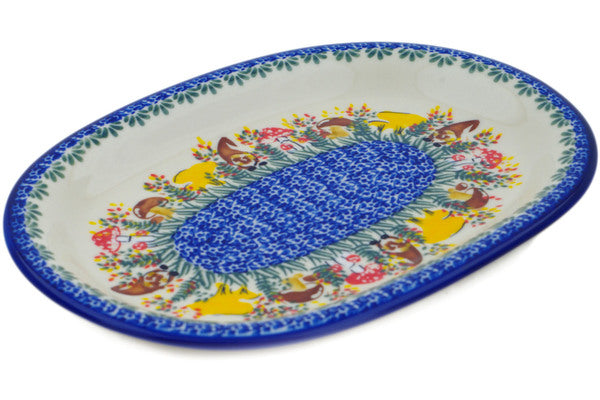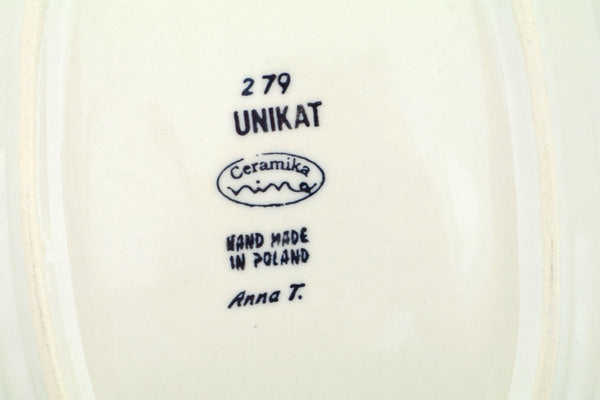 This Polish Pottery Oval Platter is handmade and handpainted by the Ceramika Nina factory in Boleslawiec, Poland. Manufacturer item number H1518P. It is 1¼" high and measures 11½" by 8½". The capacity of this Oval Platter is 18.60 oz (brimful) and it weighs 2.3 lbs. It is part of the Mushroom Love Collection.