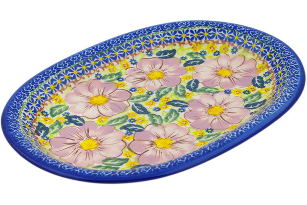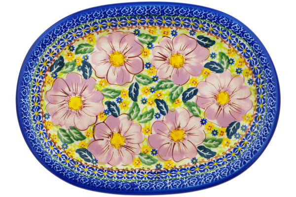 This Polish Pottery Oval Platter is handmade and handpainted by the Ceramika Nina factory in Boleslawiec, Poland. Manufacturer item number H3096P. It is 1¼" high and measures 11½" by 8½". The capacity of this Oval Platter is 18.60 oz (brimful) and it weighs 2.3 lbs. It is part of the Pink Delight Collection.