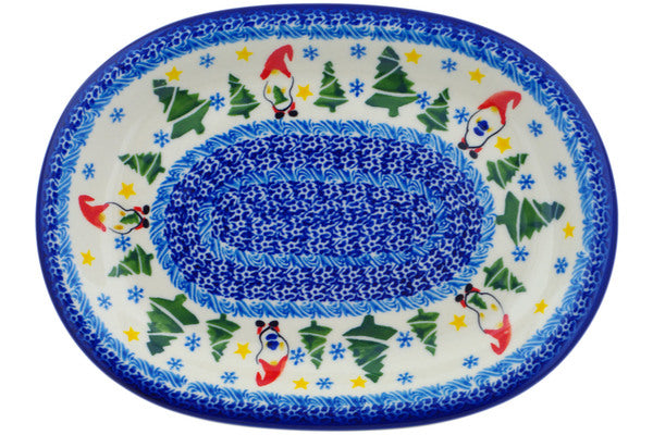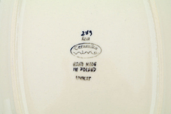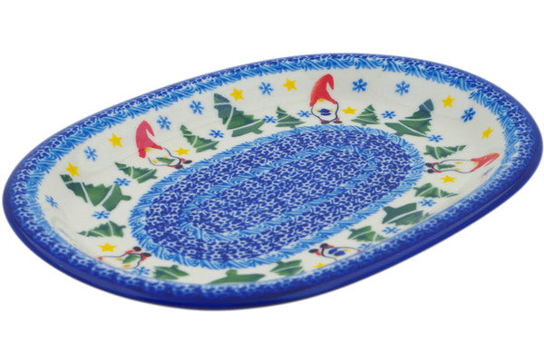 This Polish Pottery Oval Platter is handmade and handpainted by the Ceramika Nina factory in Boleslawiec, Poland. Manufacturer item number H1461P. It is 1¼" high and measures 11½" by 8½". The capacity of this Oval Platter is 18.60 oz (brimful) and it weighs 2.3 lbs. It is part of the Twinkle Twinkle Little Gnome Collection.