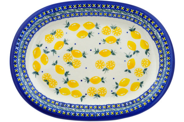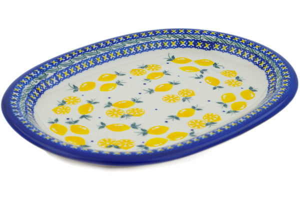 This Polish Pottery Oval Platter is handmade and handpainted by the Ceramika Bona factory in Boleslawiec, Poland. Manufacturer item number H3448O. It is 1¼" high and measures 11½" by 8½". The capacity of this Oval Platter is 18.60 oz (brimful) and it weighs 2.3 lbs. It is part of the When Life Gives You Lemons Collection.