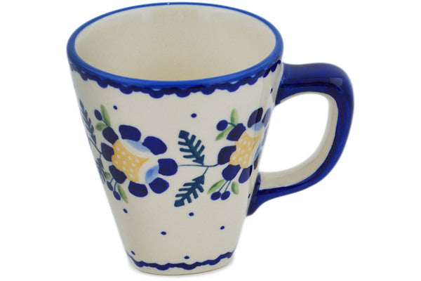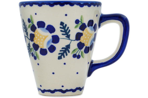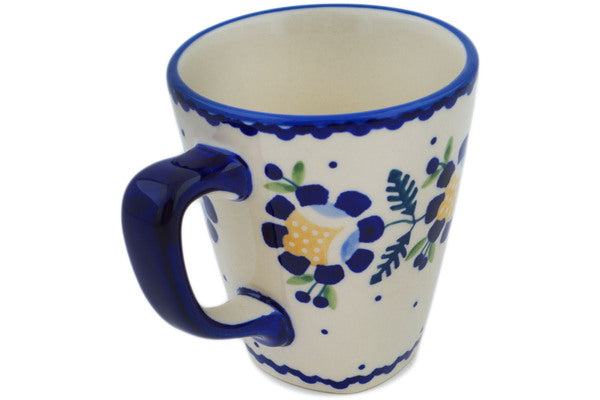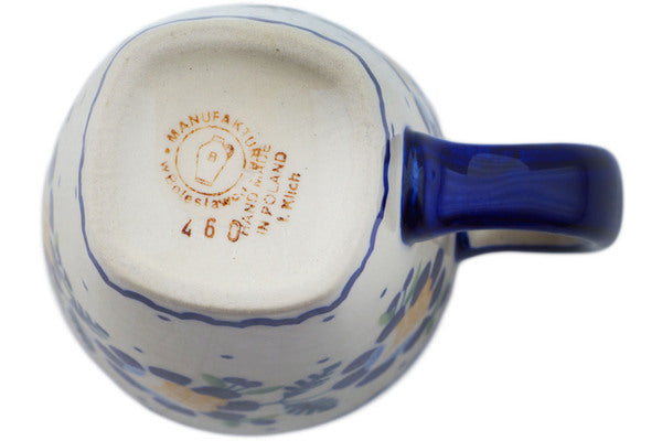 This Polish Pottery Mug is handmade and handpainted by the Manufaktura factory in Boleslawiec, Poland. Manufacturer item number H0664O. It is 4" high and measures 4¾" by 3¾". The capacity of this Mug is 10.62 oz (brimful) and it weighs 0.8 lbs. It is part of the Orange And Blue Flower Collection.