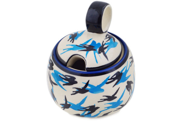 This Polish Pottery Sugar Bowl is handmade and handpainted by the Zaklady Ceramiczne factory in Boleslawiec, Poland. Manufacturer item number H4537N. It is 4¾" high and measures 4¼" by 4¼". The capacity of this Sugar Bowl is 11.36 oz (brimful) and it weighs 1.0 lbs. It is part of the Flocking Collection.