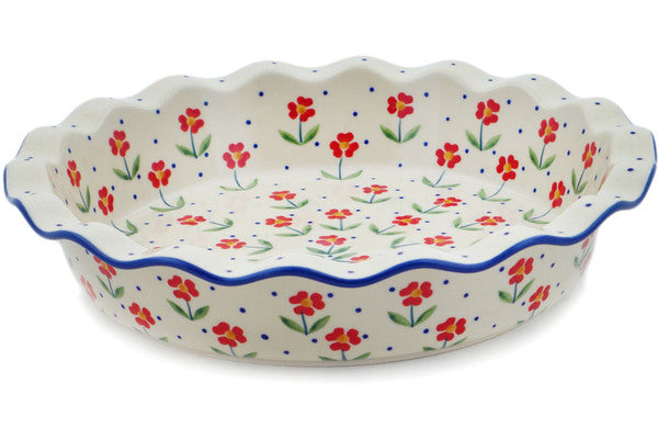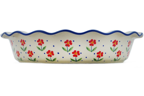 This Polish Pottery Pie Dish is handmade and handpainted by the Manufaktura factory in Boleslawiec, Poland. Manufacturer item number H6031O. It is 2¼" high and measures 10¾" by 10¾". The capacity of this Pie Dish is 49.88 oz (brimful) and it weighs 2.5 lbs. It is part of the Red Primrose Collection.