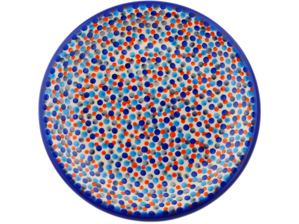 This Polish Pottery Plate is handmade and handpainted by the Ceramika Bona factory in Boleslawiec, Poland. Manufacturer item number H2197R. It is 1½" high and measures 11½" by 11½". The weight of this Plate is 2.5 lbs. It is part of the Polka Dot Frenzy Collection.