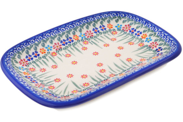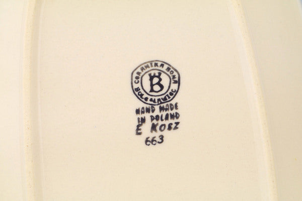 This Polish Pottery Platter is handmade and handpainted by the Ceramika Bona factory in Boleslawiec, Poland. Manufacturer item number H3974Q. It is 1½" high and measures 11½" by 8¼". The weight of this Platter is 2.2 lbs. It is part of the Blissful Daisy Collection.
