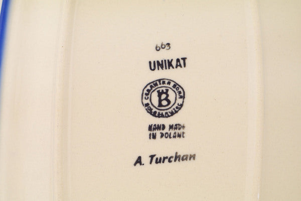 This is a Polish pottery Unikat (Signature) Platter, which means that it has been hand painted with both sponges and brushes and it is signed by the artist who painted it. Unikat pieces are the most intricate works of art. Larger Unikat items take hours of very careful work to finish.
