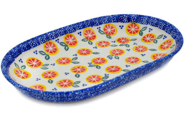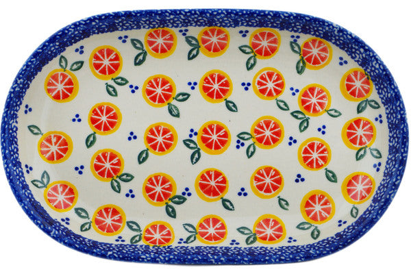This Polish Pottery Platter is handmade and handpainted by the Ceramika Bona factory in Boleslawiec, Poland. Manufacturer item number H1942P. It is 1¼" high and measures 10¾" by 6¾". The weight of this Platter is 1.5 lbs. It is part of the Citrus Craze Collection.