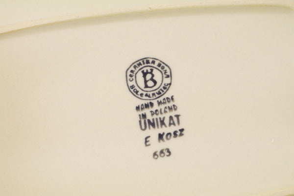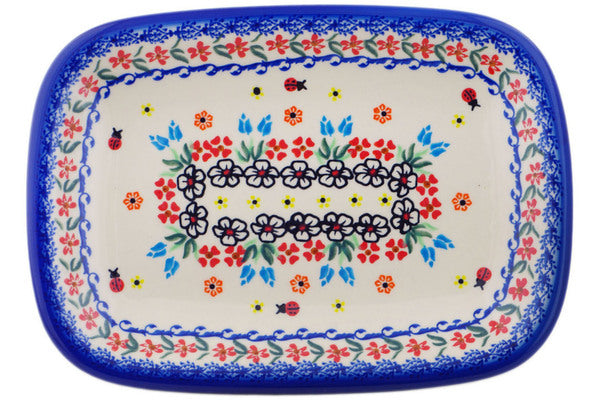 This Polish Pottery Platter is handmade and handpainted by the Ceramika Bona factory in Boleslawiec, Poland. Manufacturer item number H3898Q. It is 1½" high and measures 11½" by 8¼". The weight of this Platter is 2.2 lbs. It is part of the Fanciful Ladybug Collection.