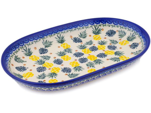 This Polish Pottery Platter is handmade and handpainted by the Ceramika Bona factory in Boleslawiec, Poland. Manufacturer item number H1865P. It is 1¼" high and measures 10¾" by 6¾". The weight of this Platter is 1.5 lbs. It is part of the Pineapple Parade Collection.