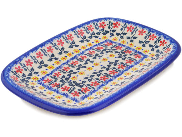 This Polish Pottery Platter is handmade and handpainted by the Ceramika Bona factory in Boleslawiec, Poland. Manufacturer item number H4158Q. It is 1½" high and measures 11½" by 8¼". The weight of this Platter is 2.2 lbs. It is part of the Red Sunflower Collection.
