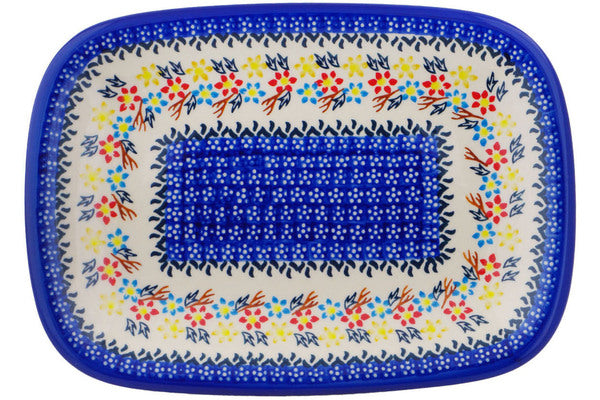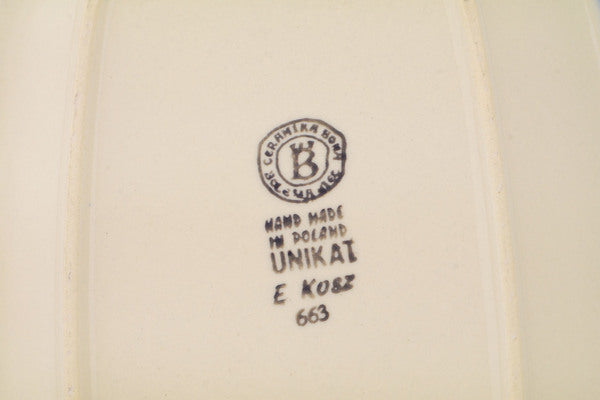 This Polish Pottery Platter is handmade and handpainted by the Ceramika Bona factory in Boleslawiec, Poland. Manufacturer item number H1955Q. It is 1½" high and measures 11½" by 8¼". The weight of this Platter is 2.2 lbs. It is part of the Spring Flower Ring Collection.