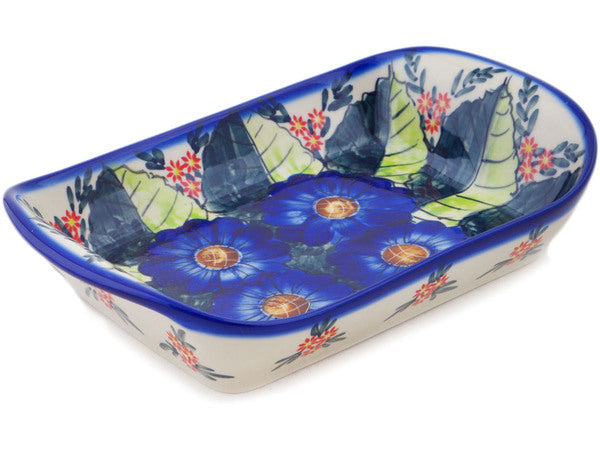 This Polish Pottery Platter with Handles is handmade and handpainted by the Ceramika Bona factory in Boleslawiec, Poland. Manufacturer item number H4061Q. It is 2¼" high and measures 11" by 7". The weight of this Platter with Handles is 2.3 lbs. It is part of the Blue Bouquet Collection.