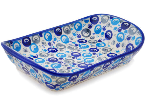 This Polish Pottery Platter with Handles is handmade and handpainted by the Ceramika Bona factory in Boleslawiec, Poland. Manufacturer item number H3140Q. It is 2¼" high and measures 11" by 7". The weight of this Platter with Handles is 2.3 lbs. It is part of the Blue Peacock Eye Collection.