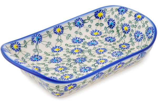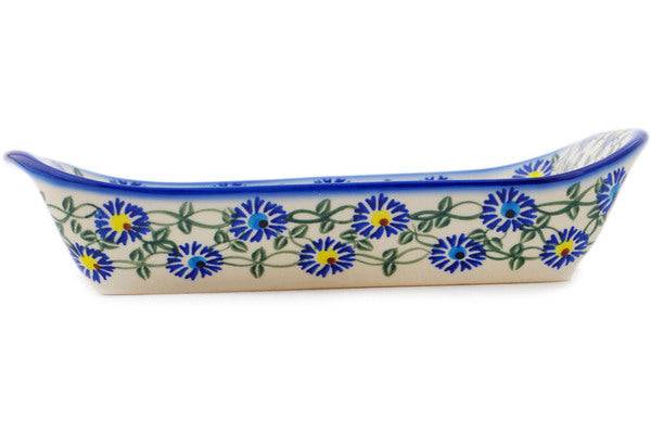 This Polish Pottery Platter with Handles is handmade and handpainted by the Ceramika Bona factory in Boleslawiec, Poland. Manufacturer item number H1895R. It is 2¼" high and measures 11" by 7". The weight of this Platter with Handles is 2.3 lbs. It is part of the Blue Thistle Beauty Collection.