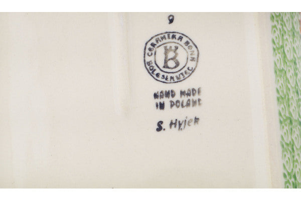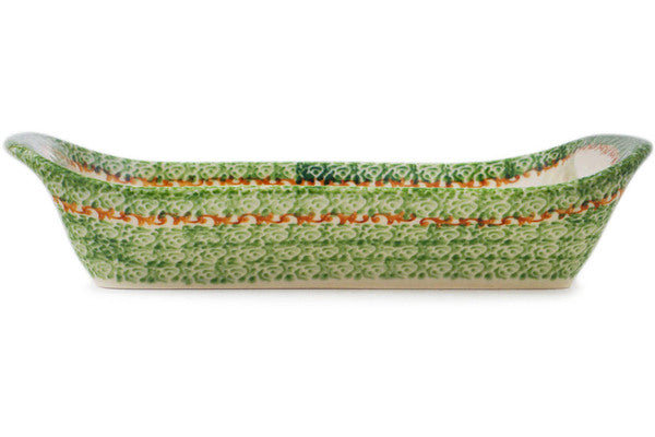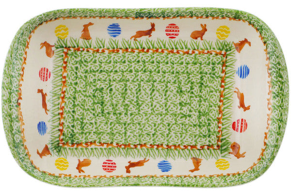This Polish Pottery Platter with Handles is handmade and handpainted by the Ceramika Bona factory in Boleslawiec, Poland. Manufacturer item number H9840Q. It is 2¼" high and measures 11" by 7". The weight of this Platter with Handles is 2.3 lbs. It is part of the Chocolate Bunny Collection.