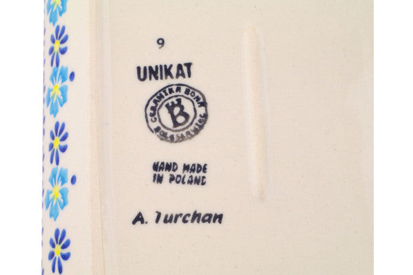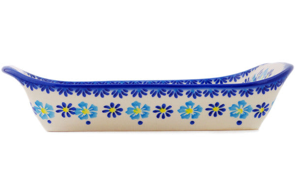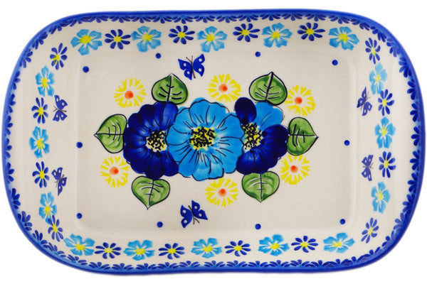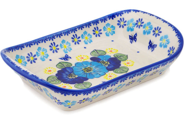 This Polish Pottery Platter with Handles is handmade and handpainted by the Ceramika Bona factory in Boleslawiec, Poland. Manufacturer item number H3539Q. It is 2¼" high and measures 11" by 7". The weight of this Platter with Handles is 2.3 lbs. It is part of the Endless Summer Collection.