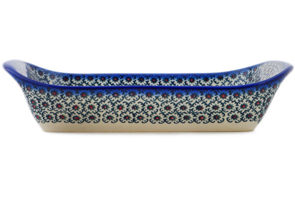 This Polish Pottery Platter with Handles is handmade and handpainted by the Ceramika Bona factory in Boleslawiec, Poland. Manufacturer item number H9719Q. It is 2¼" high and measures 11" by 7". The weight of this Platter with Handles is 2.3 lbs. It is part of the Field Of Black Daisies Collection.