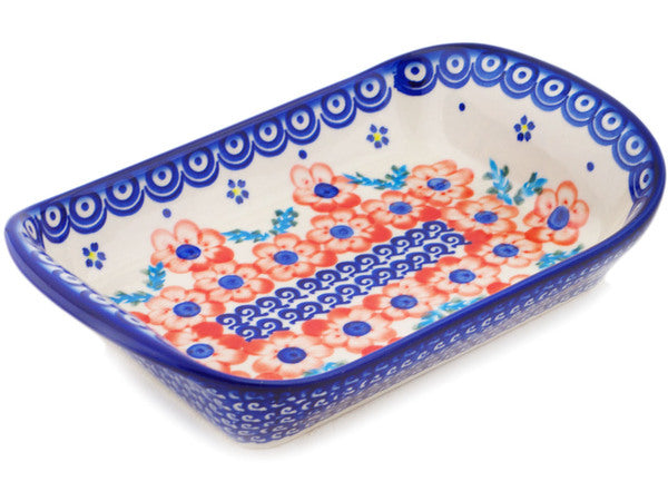 This Polish Pottery Platter with Handles is handmade and handpainted by the Ceramika Bona factory in Boleslawiec, Poland. Manufacturer item number H7110Q. It is 2¼" high and measures 11" by 7". The weight of this Platter with Handles is 2.3 lbs. It is part of the Flower Star Collection.