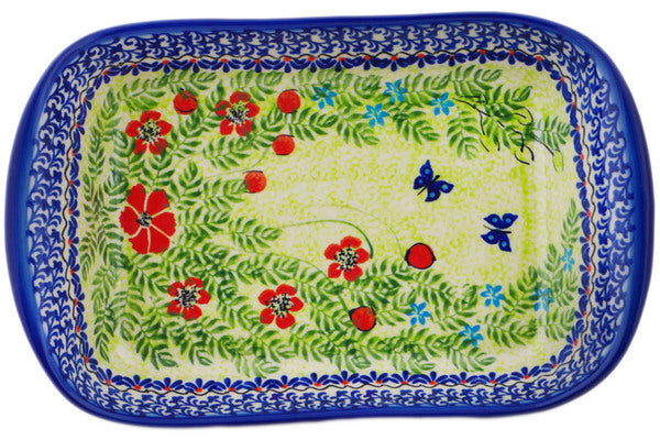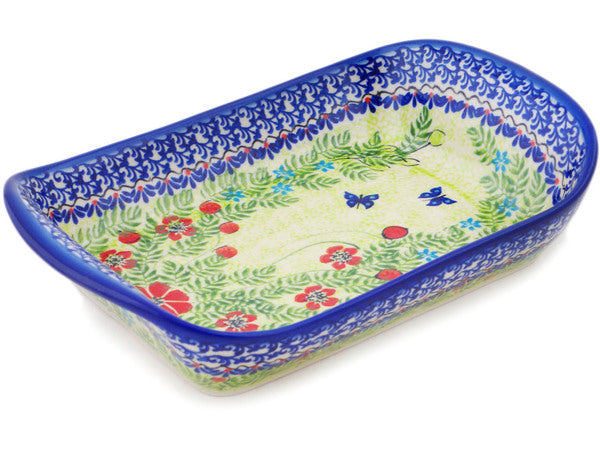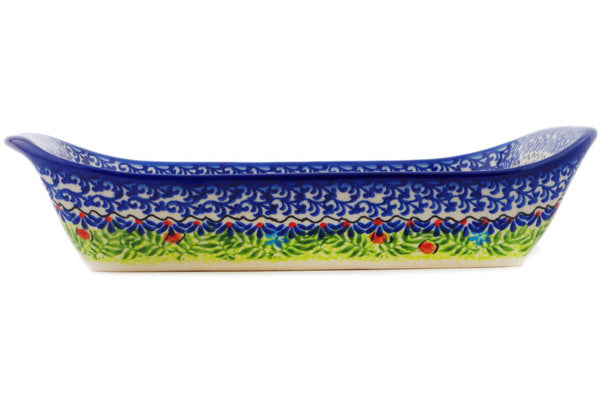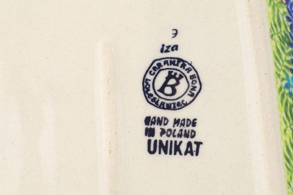 This Polish Pottery Platter with Handles is handmade and handpainted by the Ceramika Bona factory in Boleslawiec, Poland. Manufacturer item number H8773Q. It is 2¼" high and measures 11" by 7". The weight of this Platter with Handles is 2.3 lbs. It is part of the Metamorphosis Collection.