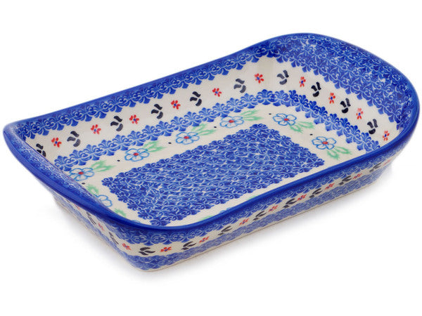 This Polish Pottery Platter with Handles is handmade and handpainted by the Ceramika Bona factory in Boleslawiec, Poland. Manufacturer item number H1996R. It is 2¼" high and measures 11" by 7". The weight of this Platter with Handles is 2.3 lbs. It is part of the Sweet Day Collection.