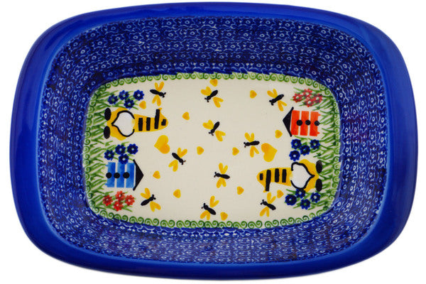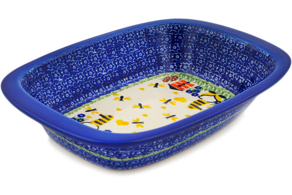 This Polish Pottery Rectangular Baker with Handles is handmade and handpainted by the Ceramika Nina factory in Boleslawiec, Poland. Manufacturer item number H2667P. It is 2¼" high and measures 11¼" by 7¾". The capacity of this Rectangular Baker with Handles is 45.48 oz (brimful) and it weighs 2.4 lbs. It is part of the Beekeeper Gnome Collection.