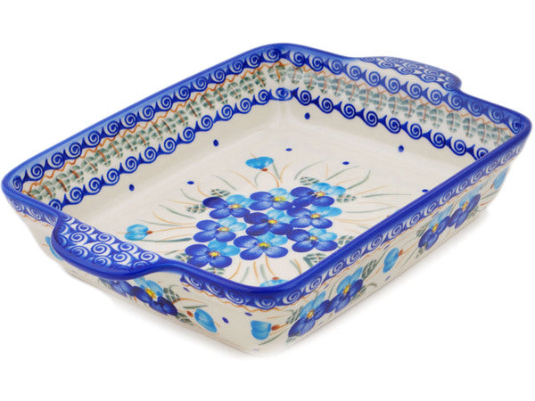 This Polish Pottery Rectangular Baker with Handles is handmade and handpainted by the Ceramika Bona factory in Boleslawiec, Poland. Manufacturer item number H0733R. It is 2¼" high and measures 11½" by 8¼". The capacity of this Rectangular Baker with Handles is 348.62 oz (brimful) and it weighs 22.4 lbs. It is part of the Blue Pansy Collection.